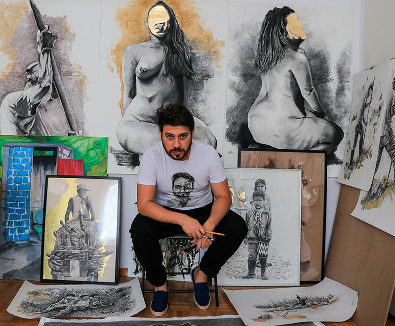 Jhoseth dibuja lo que ve especialmente en el contexto colombiano. Recorriendo las calles de algunas grandes ciudades, pero también el campo colombiano compartiendo así con los campesinos y los indígenas.